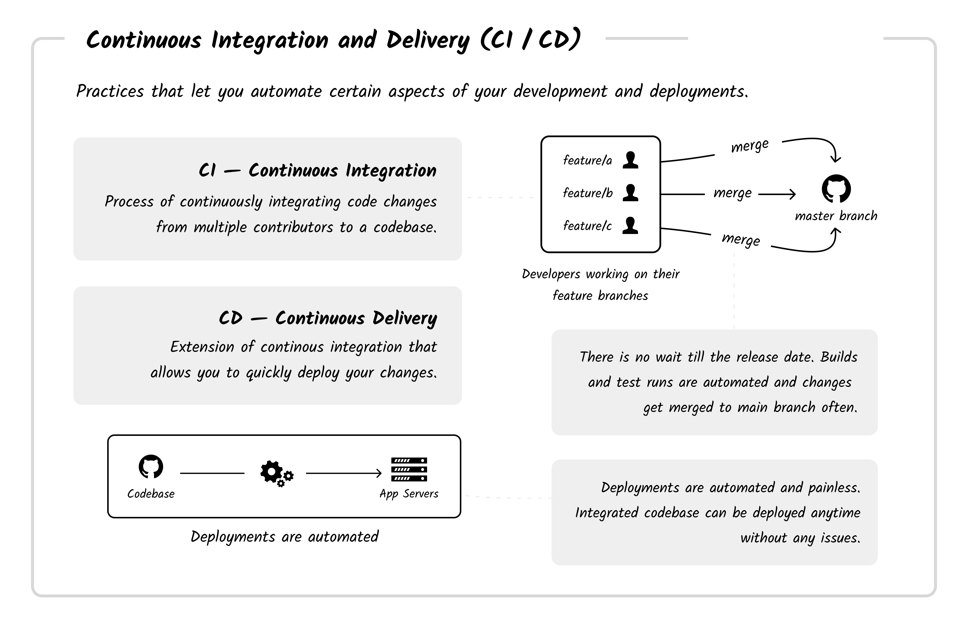 The image below details the differences between the continuous integration and continuous delivery. Also, here is the all in one course to master CI and CD.