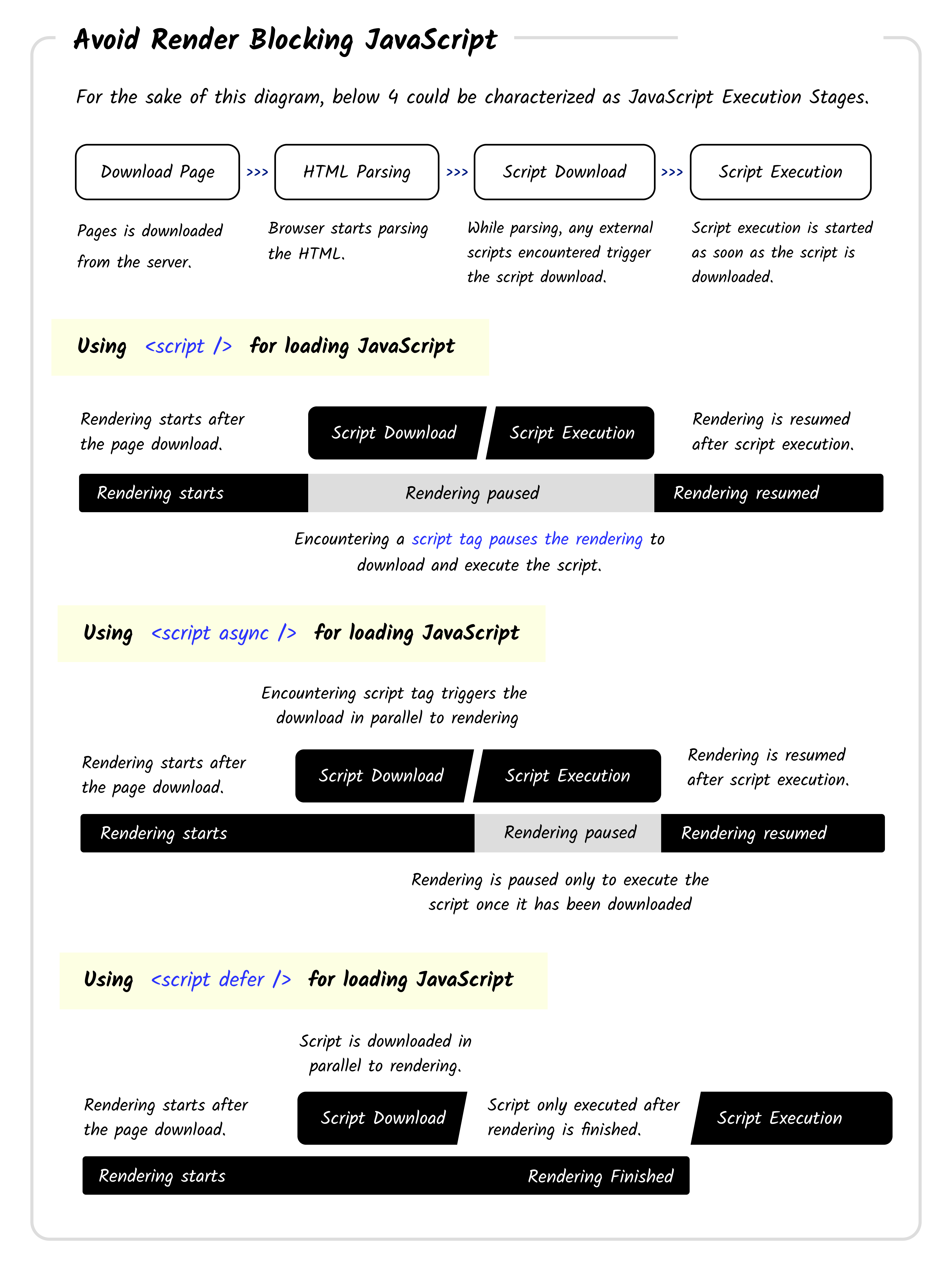 Learn how to avoid render blocking JavaScript using async and defer scripts.
